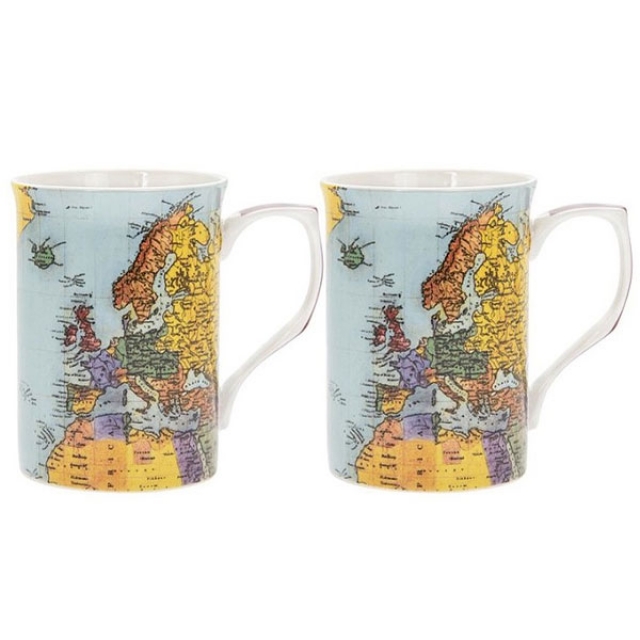 Set of two fine bone china mugs featuring world map. Suitable for the dishwasher and are microwave safe. Capacity of 280ml. Gift boxed.