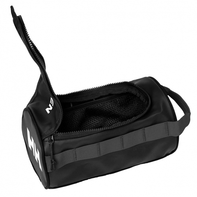 Cestovná taška na toaletné potreby z vodotesnej hlavnej tkaniny na zips s pútkom na zavesenie.